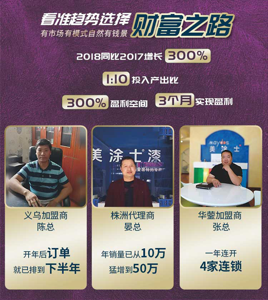 2018年,美涂士藝術(shù)涂料同比增長300%,每年增加200多家店鋪。其中,義烏加盟商陳總自開業(yè)以來已下訂單到下半年。株洲代理商晏總的年銷售額從2018年的10萬飆升至50萬。華菳加盟商張總在一年內(nèi)開了四家連鎖店。財富的夢想正在一個接一個地實現(xiàn)。
