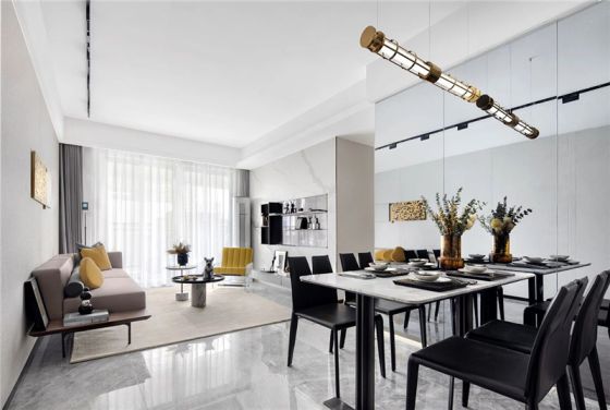 設(shè)計(jì)以低調(diào)的黑白灰呈現(xiàn)現(xiàn)代簡(jiǎn)約之美,棕色打破沉悶節(jié)奏,提升空間質(zhì)感。硬朗的金屬、玻璃材質(zhì)凝練精致品味,上好的意式皮革及布藝則營(yíng)造了柔軟舒適的居住氛圍。