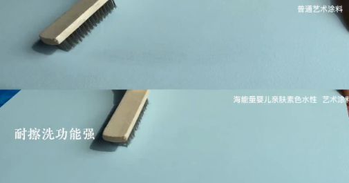 和市面上常見的涂料一起進行測試對比,使用鋼刷來回摩擦后,常見涂料有明顯刮痕,而嬰兒親膚素色經過鋼刷摩擦后,觀察面板,其表面并無損耗。