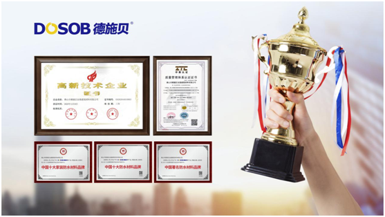 德施貝自成立來憑借過硬的產品,自主研發的技術,陸續通過“ISO9001:2008質量管理體系”、“中國綠色建材產品推廣”、“中國建材首選品牌”、“國家建材AAA級質量服務體系”等認證,并在《中國品牌網》舉辦的“行業十大品牌評選盛典”活動中一舉奪得“中國十大防水材料品牌”、“中國十大家裝防水材料品牌”、“中國著名防水材料品牌”三大榮譽。