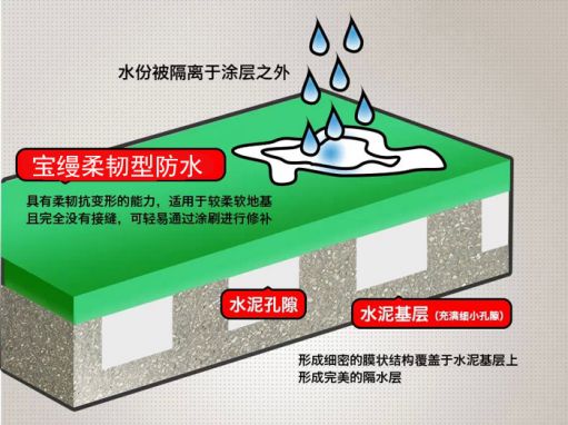 寶縵JS-200柔韌型防水是柔性防水涂料,干固后形成一層彈性防水膜,就像給地面穿上一層小雨衣,防止水分滲入。