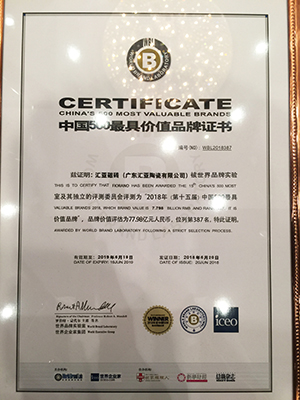 Lab)主辦的(第十五屆)“世界品牌大會”在北京舉行,會上發布了2018年度(第15屆)“中國500最具價值品牌”榜單。匯亞磁磚與國家電網、騰訊、海爾、工商銀行、中國人壽等各行各業的優秀價值品牌一同榮獲“中國500最具價值品牌”。匯亞瓷磚品牌價值評估躍升至77.98億元,較往年增長12.26億元!
