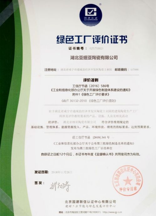 亞細亞瓷磚喜獲“國內綠色工廠”認證