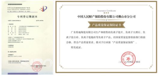 負離子瓷磚國家發明專利證書(左)和負離子瓷磚具有相關保險證書(右) 產品質量更為可信所以在挑選值得買的負離子瓷磚時候,要看清楚負離子瓷磚發明專利證書、產品質量保證保險證書、負離子瓷磚相關檢測報告!如果發現宣傳上過多強調“殺菌消毒、有助睡眠、改善神經衰弱、失眠,通暢心腦血管,降低血液粘稠度,提高人體免疫力”等等各類概念,可要提高警惕辨別真相。
