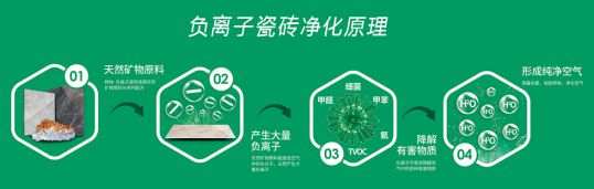 負離子瓷磚核心原理是瓷磚通過一定的方式,讓其所含物質元素能夠與空氣中的水分子反應,誘發產生負離子,從而與空氣中渾濁氣體產生結合,吸附,集塵起到凈化的作用。所以負離子瓷磚是真的能夠改善空氣質量,減少裝修過程中危害呼吸道健康等問題的瓷磚新品類。