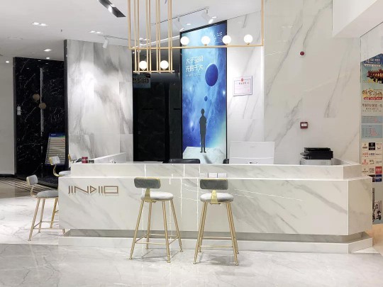大面積的頂級卡拉卡塔白鋪貼,其潔白的色澤、如玉的質感、別致的紋理、整體營造出一種雅致舒適的感覺,給人豁然一新的視覺體驗。然而那恰到好處的品牌金屬logo吊燈的點綴,既填補布局的空曠感,又讓前臺更熠熠生輝,從只可“遠觀”變成可以“褻玩”。