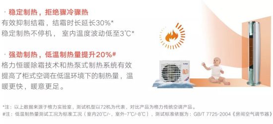 格力一級能效變頻柜機“i耀”創新恒暖除霜技術,有效抑制空調化霜頻率,降低空調化霜次數。即使化霜時也不從室內吸取熱量,最大限度的減少室內溫度波動。真正做到除霜不驟冷,持續供熱,溫暖常伴。