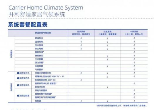 都說設備選型設計匹配難就像一只攔路虎,直接擋住了廣大暖通經銷商伙伴通往兩聯供市場的去路。別擔心,開利有舒適家居氣候系統配置表,設備型號齊全,系統配置方便,用戶需要什么樣的舒適體驗和系統功能,對應選擇,一目了然,套餐式選配為暖通公司和用戶解決選型難題。