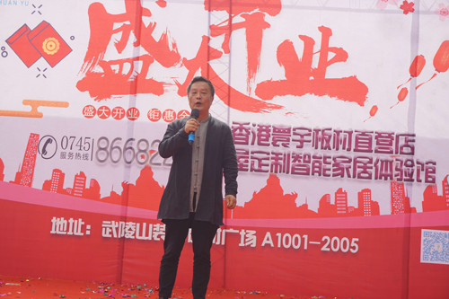 首先香港寰宇集團董事長周祚新做開業致辭,感謝各位來賓的光臨,感謝武陵山建材廣場的支持以及懷化市市委市政府、懷化學院、懷化市室內裝飾協會、所有合作的裝飾公司對寰宇的大力支持與幫助。并表示對于香港寰宇直營店(全屋定制體驗館)的未來充滿了期望。周董表示香港寰宇直營店(全屋定制體驗館)與懷化學院藝術院達成戰略合作,讓消費者可以得到更好的設計體驗,而且牢記為人類健康作貢獻的使命,為廣大消費者提供更加完美、環保、健康的家居產品。開業之際,周董還不忘明天是舉國同慶的國慶佳節,提前祝愿我們的祖國繁榮昌盛,在場的各位來賓身體健康、家庭幸福、萬事如意、笑口常開!