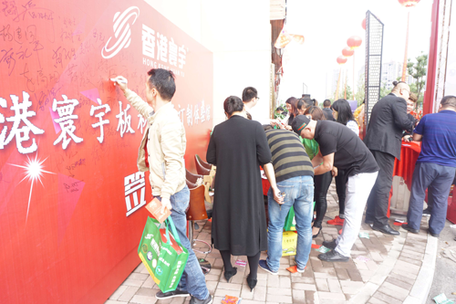 到場嘉賓在簽到墻上留下對香港寰宇板材的祝福