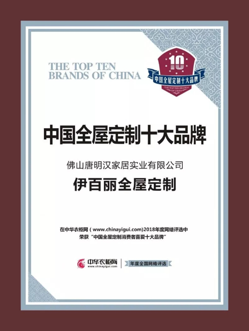 9月1日,中華建材網(wǎng)主辦的“致敬行業(yè)驅(qū)動(dòng)力,2018中國(guó)家居建材行業(yè)十佳品牌、十大品牌”網(wǎng)絡(luò)評(píng)選中,伊百麗全屋家居榮獲“中國(guó)全屋定制消費(fèi)者喜愛(ài)十大品牌”。