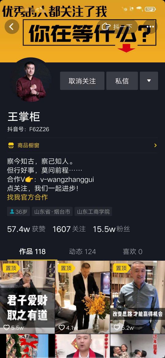 “王掌柜”,定位是抖音個人IP號,迄今為止,已發布了118條作品,累積粉絲15.5w,點贊量最高的視頻達到5.5w,這對于一個沒有團隊打造的王總來說,能取得這樣的成績確實亮眼。