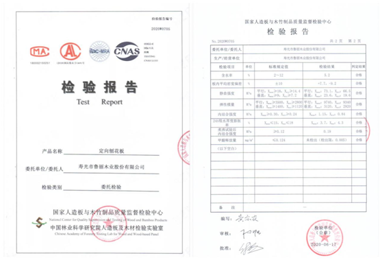 優質基材+MDI生態膠黏劑助力魯麗家居產品實現零甲醛添加,經國家人造板與木竹制品質量監督檢驗中心檢測,未檢出甲醛釋放,魯麗無醛OSB板甲醛釋放量≤0.005mg/m3。