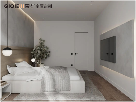主臥,呈現(xiàn)保有簡潔與純粹的視感維度,木飾面與膚感板的組合,延伸出墻、柜與門的序列感,構(gòu)造起溫馨的生活空間。