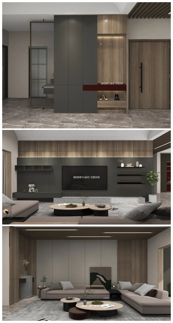 客廳木色與灰色搭配,簡約不同凡響,淺灰色的沙發,無主燈設計,不落俗套且很有個性,看似簡單隨意,卻在細節處彰顯著藝術美學。