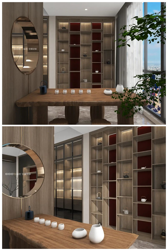 書房至簡的線條設計,沒有一處多余的修飾,在木色的世界中,那一抹亮眼的紅色,足以表達卓爾不群的個性。