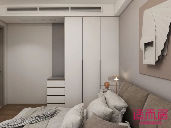 主人房已灰色調為主色調,迎合了房子主人對高級感的需求,莫蘭迪灰的衣柜+灰色的床+灰色乳膠漆的床背景墻,高級感滿滿。