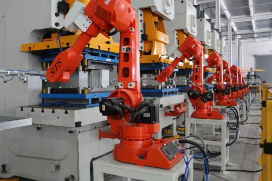 眼前擺列整齊的“龐然大物”,是我們的自動化沖壓機器人。全部采用廣州啟帆的六軸自動化機器人,比人類手腕還要靈活,360度無死角。