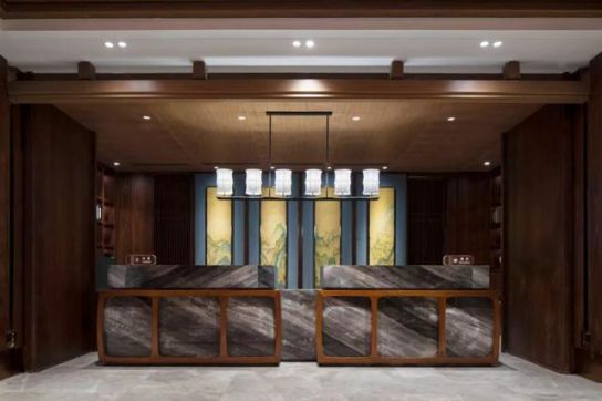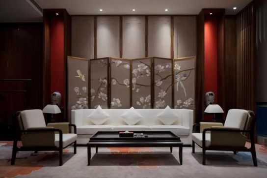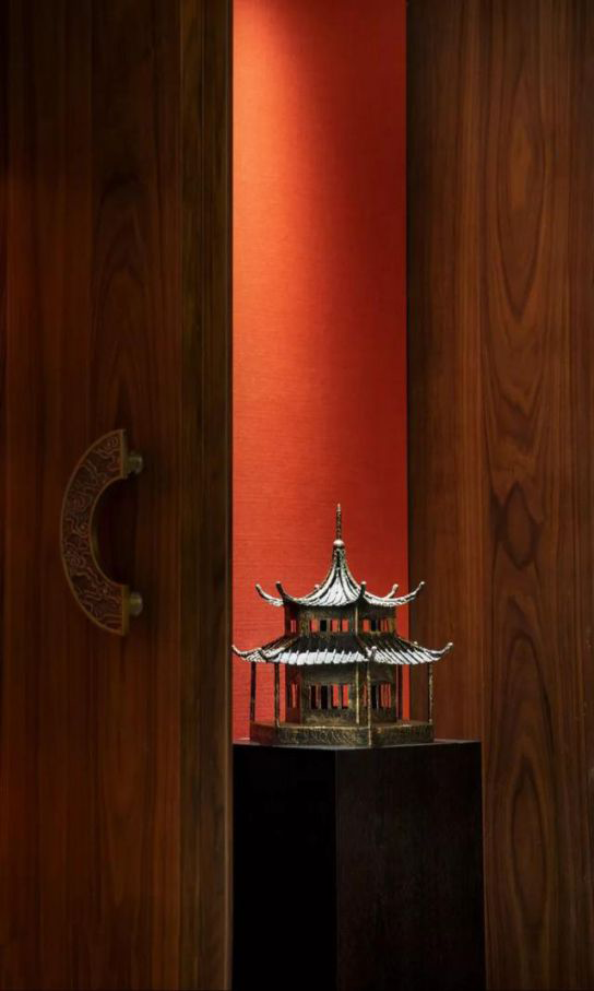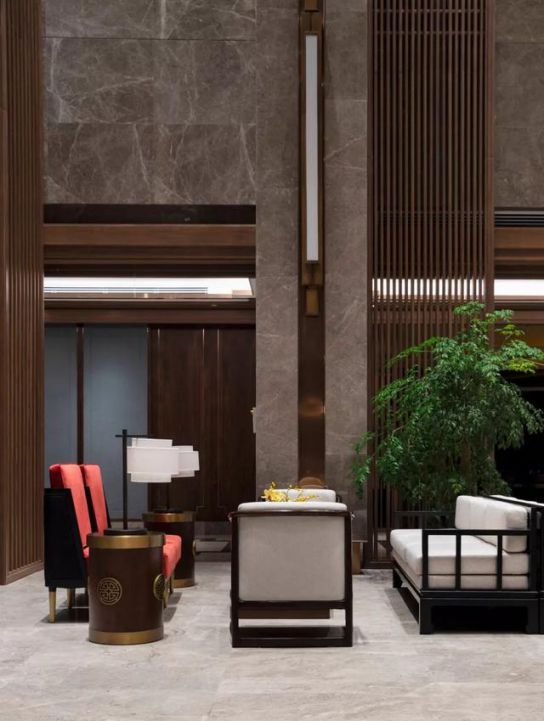 整個大堂以東方韻味的裝飾設計風格展現豐富的紅色文化傳承。前廳服務結構對稱分布,中軸盡頭將傳統照壁進行了改良,成為視覺中心點。室內陳設采用了明、清家具造型和款式特征,并且將中國尊、鼎、璽、韶樂、書法雕塑融入之中,為大堂空間增添了無限的藝術張力。