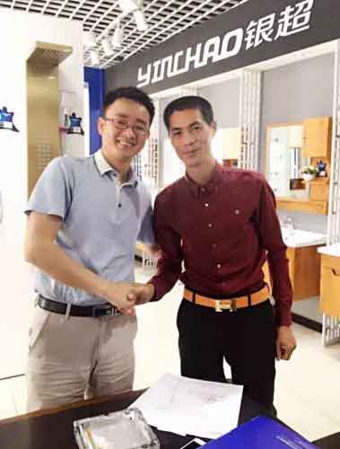 品尚衛浴營銷總監蔡子業(右)與福建家家樂建材超市董事長朱行(左)