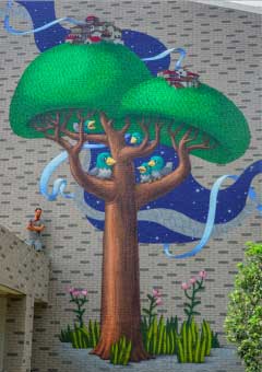 Kislow墻繪中的參天大樹,樹枝上棲息著可愛的小鳥,樹冠上載著“南京味兒”的騎馬樓