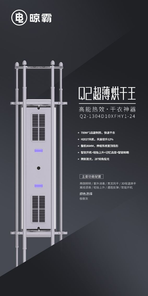 除此之外,Q2超薄烘干王智能晾衣機,技藝廣博,一機多能,集合消毒、風干、烘干、聲控等眾多實用功能,一臺晾衣機=晾衣架+干衣機+消毒器,是不可多得的旗艦新品。必將為每一位用戶創造更好體驗、更高品質的使用服務。