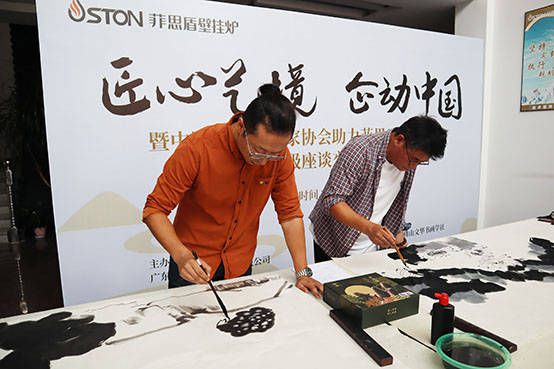 活動現場,藝術家們不僅參與產品設計交流,還紛紛潑墨揮毫,作畫題詞,現場贈送留念。