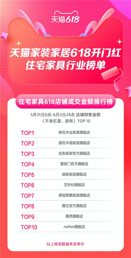 以住宅家具為例,5月31日0點-6月3日24點,按618店鋪銷售金額(不含紅星、居然) 為標準,前三名分別為林氏木業家具旗艦店、源氏木語家居旗艦店、全友家居官方旗艦店。