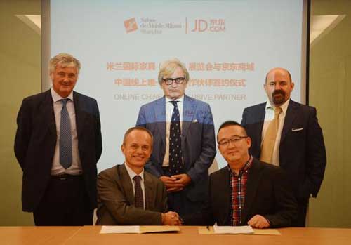 米蘭國際家具展主辦方FLAEventi首席執(zhí)行官GiovannidePonti先生(第一排左)與京東商城服飾家居事業(yè)部家居家裝部總經(jīng)理周新元(第一排右)簽署戰(zhàn)略合作協(xié)議