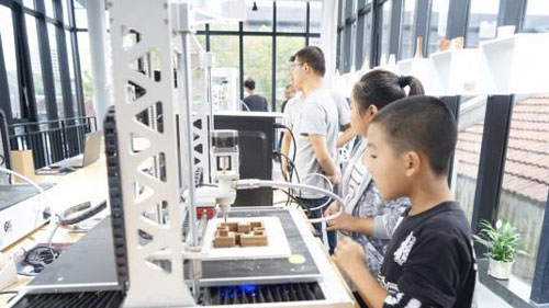景德鎮陶溪川文創街區,3D陶瓷打印體驗中心吸引了很多學生參觀