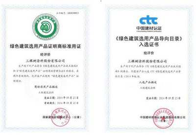 2014年9月23日,經(jīng)國家建筑材料測試中心評定,三棵樹工程建筑涂料產(chǎn)品符合《綠色建筑選用產(chǎn)品技術(shù)指南》和《“綠色建筑選用產(chǎn)品”證明商標(biāo)管理辦法》的要求,特頒發(fā)“綠色建筑選用產(chǎn)品證明商標(biāo)準(zhǔn)用證”,并成功入選《綠色建筑選用產(chǎn)品導(dǎo)向目錄(2014版)》。入選名錄的企業(yè)分布在油漆、瓷磚、外墻保溫系統(tǒng)、木地板、礦棉等建材行業(yè)的各個領(lǐng)域,總數(shù)不到60家。